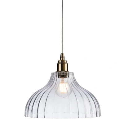 Elevate your living spaces with the Firstlight Victory Ribbed-Effect Style 28cm Pendant Light in Antique Brass and Clear Ribbed Glass. This stunning pendant light is more than just a lighting fixture; it's a work of art that adds a touch of elegance and charm to your home.The Victory Pendant Light is a stylish masterpiece, featuring a clear ribbed glass shade that adds a unique and captivating texture. The antique brass metalwork complements the glass perfectly, creating a timeless and sophisticated design that seamlessly fits into any decor.With a 28cm diameter and an adjustable drop length ranging from 300mm to 1350mm, this pendant light is incredibly versatile. It can be the perfect addition to your kitchen, living room, dining room, or bedroom, adapting effortlessly to any space.The ribbed glass shade is the standout feature of this pendant light. Its attractive ribbed effect not only adds a distinctive touch but also scatters light in a mesmerising way, creating a warm and inviting atmosphere. The antique brass finish on the metalwork adds a touch of vintage charm, making it a unique addition to your decor.Firstlight Products, renowned for their commitment to quality and excellence in lighting, manufactures the Victory Pendant Light. It's built to last, using premium materials that ensure durability and long-lasting performance.This pendant light accommodates one E27 bulb with a maximum wattage of 60W (bulb sold separately). The E27 cap fitting simplifies installation and maintenance. The clear ribbed glass shade scatters light in a captivating manner, making it ideal for setting the perfect ambiance in your living space.Setting up the Victory Pendant Light is a straightforward process. It comes with a ceiling rose featuring a diameter of 93mm and a height of 30mm. The pendant light requires a single E27 bulb, providing you with the flexibility to choose the perfect lighting for your space.Transform your home with the Firstlight Victory Ribbed-Effect Style 28cm Pendant Light. This pendant light combines style, versatility, and exceptional quality, making it a captivating addition to your kitchen, living room, dining room, or bedroom.Requires 1 x E27 bulb max 60W (sold separately).