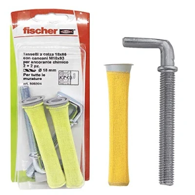 The yellow fis hn anchor is ideal for fixing on perforated supports. The mesh of the sock ensures perfect filling of the voids and prevents the resin from escaping. For chemical anchors The injection of the resin from the mixing spout of the two-component cartridges is facilitated by the presence of the adapter (centering nozzle to be interposed between FIS MR PLUS mixer and FIS HN socket). 2 Gates made of steel class 4.8 galvanised white. The blister includes: 2 x FIS H 18 x 85 N sock plugs + 2 x jaws M10 x 93, Manufacturer: FISCHER