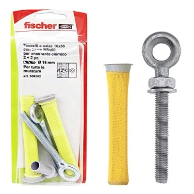 The yellow sock dowel is ideal for attaching to perforated straps. The net of the stockings ensures a perfect filling of the gaps and prevents resin from escaping. For chemical anchoring Ideal for: heavy anchors such as concrete, stone, solid brick and drill holes. Package Content: 2 x base dowels 16 x 85 mm + 2 eyelets M8 x 60RPAPAPAPAPAPAPAPAPAPAPA2 20232. 023Hole diameter: 16 mm; Drill depth: 95 mm; Insertion depth: 85 mm; Eyelet diameter: 11 mm; Thread eyelet: M8 x 60 mm International products have separate terms, are sold from abroad and may differ from local products, including fit, age ratings, and language of product, labeling or instructions., Manufacturer: FISCHER