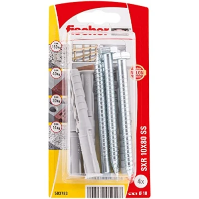 Main advantages: SXR anchor with galvanized steel countersunk screw is a certified fixation for masonry and concrete in multiple non-structural fixings, with fire resistance class F90. How to use: make hole with drill bit of 10 mm in diameter, clean the hole, insert the anchor using a hammer, tighten the screw; the plug and screw cross the material to be fixed. Applications: metal structures, stone placed, clotheslines, awnings, parabolics, railings, brackets, hand ladders, cable trays, escalators, metal carpentry, wooden constructions. Product information: 80mm is the total length of the dowel, 50mm is the part of the dowel that would have to traverse the wall at least and 30mm would be the maximum thickness of the element to be fixed. Contents: 1 x 10x80 SXR Blister with 4 units, pre-assembled, fischer., Weight: 0.0220462262 pounds, Manufacturer: fischer