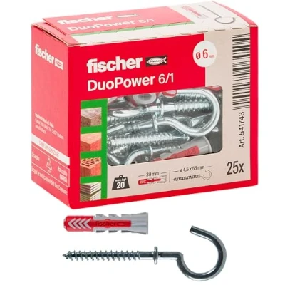 fischer 541743 Dowel with Open Eyelet Duopower, Grigio/Rosso, 6 x 30 mm, Set of 25 Pieces