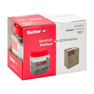 The pack contains 480 dowels SX 5 x 25 with screw distributed: 240 dowels with screw in a plastic box ProPack, 240 dowels with screw in an eco refill box to refill the glass. Drill diameter: 5 mm; Minimum hole depth: 35 mm; Dowel length: 25 mm; Max. Fixable thickness: 5 mm Backing material: solid masonry, perforated masonry The 4-way expansion ensures optimal power distribution in the material and offers high load capacity for solid and cable carrier materials The smooth part under the mounting head does not expand and prevents the formation of expansion forces on the surface of the carrier material when screwing, Manufacturer: Fischer