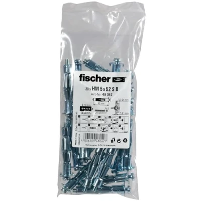 All-rounder: The versatile Fischer cavity metal dowel with metric is the re partner for all panel building materials with a thickness of 7-21 mm Installation: the cavity metal dowel suitable for pre-mounting impresses with a large contact surface of the expansion arms and a high load capacity Building materials: can be used with s with thread size M4, M5, M6 and M8 in plasterboard and gypsum fibreboard, hollow ceilings, wood wool lightweight boards, chipboard and plywood boards Applications: for attaching pictures, curtain rails, towel rails, light wall shelves/mirror cabinets, lights with holding values e.g. in plasterboard up to 25 kg Box contents: 20 x Fischer cavity metal dowels HM (HM 5 x 52 S), Weight: 0.6944561253 pounds, Manufacturer: fischer