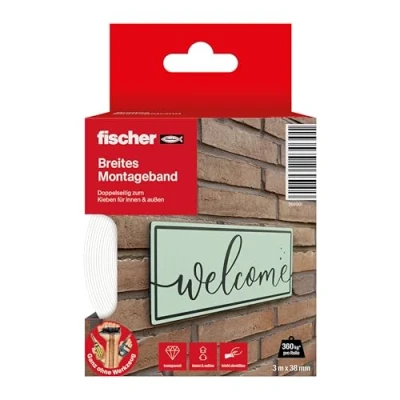 No annoying drilling: mirror, mirror to the wall can be glued with mounting tape – because thanks to the double width of the existing mounting tape from Fischer the variant ensures even better load distribution Quick and easy attachment: peel off, simply tear off the tape without scissors, attach to the element to be attached, press and you're done - full adhesive strength ahead (reaches after 24 hours) Handy and easy to use: the large roller with special liner is particularly user-friendly and allows precise work that always leads to best results Multi-purpose: The tape provides the ideal solution for effortless attachment of shelves, mirrors, dartboards and much more. on all smooth and rough surfaces and is particularly suitable for transparent objects such as glass, crystal and transparent plastics indoors and outdoors Box contents: 1 x wide mounting tape (item no. 560901), high performance double-sided tape (3 m x 35 mm). fischer