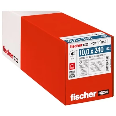 Large tightening effect: the wood screw with high-performance sliding coating and partial thread for firmly tightening the individual elements guarantees a larger contracting effect as well as a significantly increased head pull-through resistance Quick and flexible: the galvanised, blue passivated wood screw impresses with a significant reduction in screw-in time due to the increased thread pitch - this ensures quick installation for all your construction projects Clean workmanship: 3 ribs at the tip guarantee fast biting behaviour and pre-milling, in addition, the attachment is optimised and splitting of the wood significantly reduced, while higher pull-out resistance can be achieved due to the larger head diameter compared to countersunk screws Areas of application: the flat head screw with partial thread is particularly suitable for substructures and the attachment of roof insulation in coated wood, softwood as well as solid wood and wood joints and allows the wooden elements to be pulled together firmly Box contents: 50 x PowerFast II (item no. 566346), wood screws (10.0 x 240) with flat head, inner star socket and partial thread of fischer, Weight: 8.9507678372 Pounds, Manufacturer: fischer