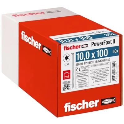 Flush-screwed: the wood screw with high-performance sliding coating and partial thread for tight tightening of the individual elements allows a flush fitting and guarantees maximum power transmission with maximum bit stability Quick and flexible: the galvanised, blue passivated wood screw impresses with a significant reduction in screw-in time due to the increased thread pitch - this ensures quick installation for all your construction projects Clean workmanship: 3 ribs at the tip guarantee fast biting behaviour and pre-milling, in addition, the setting is optimised and splitting of the wood is significantly reduced, while the look and feel are improved due to the optimised underhead geometry Areas of application: the countersunk screw with partial thread is particularly suitable for substructures and the attachment of roof insulation in coated wood, softwood as well as solid wood and wood joints and allows the wooden elements to be pulled together firmly Box contents: 50 x PowerFast II (item no. 566316), wood screws (10.0 x 100) with countersunk head, inner star socket and partial thread of fischer, Weight: 3.7699046802 Pounds, Manufacturer: fischer