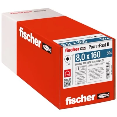 Flush-screwed: the wood screw with high-performance sliding coating and partial thread for tight tightening of the individual elements allows a flush fitting and guarantees a greater contraction effect as well as a significantly increased head pull-through resistance Quick and flexible: the galvanised, blue passivated wood screw impresses with a significant reduction in screw-in time due to the increased thread pitch - this ensures quick installation for all your construction projects Clean workmanship: 3 ribs at the top guarantee quick bite behaviour and pre-milling, in addition, the setting is optimised and splitting of the wood significantly reduced. In addition, the stepped countersunk head can be completely recessed into the wood, which allows a second component to lie flush or be screwed on Areas of application: the stepped countersunk screw with partial thread is particularly suitable for substructures and the attachment of roof insulation in coated wood, softwood as well as solid wood and wood joints and allows the wooden elements to be pulled together firmly Box contents: 50 x PowerFast II (item no. 566359), wood screws (8.0 x 160) with stepped countersunk head, inner star socket and partial thread of fischer, Weight: 4.3651527876 Pounds, Manufacturer: fischer