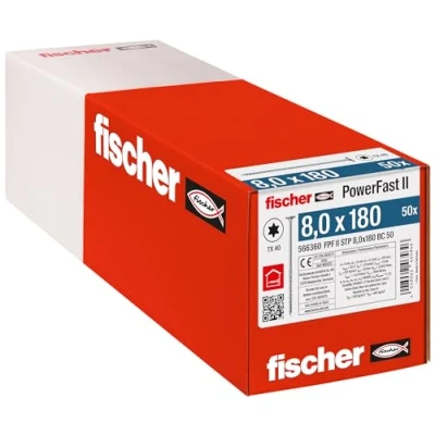 Flush-screwed: the wood screw with high-performance sliding coating and partial thread for tight tightening of the individual elements allows a flush fitting and guarantees a greater contraction effect as well as a significantly increased head pull-through resistance Quick and flexible: the galvanised, blue passivated wood screw impresses with a significant reduction in screw-in time due to the increased thread pitch - this ensures quick installation for all your construction projects Clean workmanship: 3 ribs at the top guarantee quick bite behaviour and pre-milling, in addition, the setting is optimised and splitting of the wood significantly reduced. In addition, the stepped countersunk head can be completely recessed into the wood, which allows a second component to lie flush or be screwed on Areas of application: the stepped countersunk screw with partial thread is particularly suitable for substructures and the attachment of roof insulation in coated wood, softwood as well as solid wood and wood joints and allows the wooden elements to be pulled together firmly Box contents: 50 x PowerFast II (item no. 566360), wood screws (8.0 x 180) with stepped countersunk head, inner star socket and partial thread of fischer, Weight: 4.8942622164 Pounds, Manufacturer: fischer