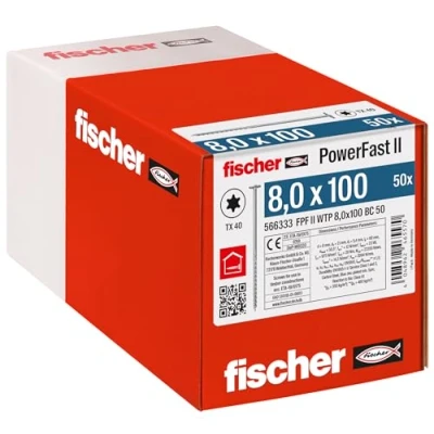 Large tightening effect: the wood screw with high-performance sliding coating and partial thread for firmly tightening the individual elements guarantees a larger contracting effect as well as a significantly increased head pull-through resistance Quick and flexible: the galvanised, blue passivated wood screw impresses with a significant reduction in screw-in time due to the increased thread pitch - this ensures quick installation for all your construction projects Clean workmanship: 3 ribs at the tip guarantee fast biting behaviour and pre-milling, in addition, the attachment is optimised and splitting of the wood significantly reduced, while higher pull-out resistance can be achieved due to the larger head diameter compared to countersunk screws Areas of application: the flat head screw with partial thread is particularly suitable for substructures and the attachment of roof insulation in coated wood, softwood as well as solid wood and wood joints and allows the wooden elements to be pulled together firmly Box contents: 50 x PowerFast II (item no. 566333), wood screws (8.0 x 100) with flat head, inner star socket and partial thread of fischer, Weight: 3.2848877038 pounds, Manufacturer: fischer