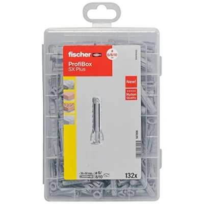 That's in it: the practical professional box contains a total of 132 expansion plugs (SX Plus) in 5 different sized compartments: 60 x SX Plus dowels 6 x 30, 60 x SX Plus dowels 8 x 40, 12 x SX Plus dowels 10 x 50 Optimal force introduction: the 4-way spreading guarantees high holding values and the expansion pressure-free dowel neck prevents damage to tiles and plaster when screwing in the screw and ensures secure anchoring Easy to install: the SX Plus dowels are perfect for pre-insertion installation, the pronounced dowel edge prevents slipping deeper into the drill hole and the special fixing wings ensure a pre-fixing of the screw, which allows both hands of the user to be free during the setting process Areas of application: the specialist in solid building materials for walls and ceilings is suitable for attaching light to medium weight objects such as motion sensors, light wall cabinets, lights, TV consoles and much more. In numerous solid and perforated building materials, such as concrete, solid and perforated bricks, natural stone and solid plaster panels Box contents: 1 x professional box SX Plus, storage box with 132 dowels (60 pieces. SX Plus 6 x 30, 60 pieces. SX Plus 8 x 40, 12 pieces. SX Plus 10 x 50) of fischer, Manufacturer: fischer