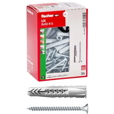 Tip diameter: 8 mm; Minimum hole depth: 70 mm; Gusset length: 50 mm; Max thickness: 10 mm Supporting materials: Solid masonry, Perforated masonry, Plasterboard Universal operation (knotted or expansion) that allows use in all the supporting materials full, perforated and in plates; uX is the right choice if you do not know the basic material Screw screwing causes expansion into solid support materials and knotting in hollow materials The side flaps of the UX ensure optimal drive of the screw; serrated anti-rotation flaps prevent rotation in the hole, Weight: 0.01 Pounds, Manufacturer: Fischer