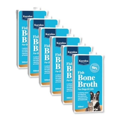 🐾 REAL & GUT-FRIENDLY INGREDIENTS: Highly nutritious, this pack of ready to use fish bone broth for dogs and cats is produced in small batches, using only 3 ingredients; fish bones, apple cider vinegar, and water, which has been simmered for hours for a nutrient-rich bone broth that has extracted every bit of goodness. Wild Caught and free from additives, preservatives, hormones, and antibiotics. Our sustainable packaging is fully recyclable and plastic-free. ✨ BETTER THAN BONE BROTH POWDER FOR DOGS: Undiluted and freshly packed straight from the cooking pot, Karnlea bone broths contain only safe and nourishing ingredients for your pet. Healthy alternative to powdered bone broth for dogs and dog gravy granules. Store in a cupboard until opened. Once opened, store in the fridge for up to 5 days or freeze into moulds for a cooling treat. Unlike our beef and lamb broths, our fish broth does not turn to jelly in the fridge as it contains a different type of collagen. ✔️HIGH IN COLLAGEN: Collagen-rich and nutrient-dense, our Fish bone broth contains only 21 calories. Karnlea's fish broth is slow cooked to squeeze in as much goodness as possible. Feed this bone broth to your pet either as it comes, frozen, as a food topper, gravy, or as a hydrating drink when mixed with a little water. 🐈 FOR HIP, JOINT, GUT, SKIN & COAT HEALTH: Karnlea fish bone broth is packed with type II collagen, protein, amino acids, minerals, and gelatin. Collagen, the building blocks of the body, helps to repair cartilage and prevent future damage, as well as soothing stiff joints. Our broths are fantastic for gut health, acting as a soothing elixir which is known to be very beneficial for leaky gut syndrome. A recovery food that can be fed in larger amounts when needed. 🐶 FOR SENIOR PETS: Our delicious and highly nutritious liquid food broth is suitable for all sizes, ages and breeds, and perfect to aid health in sick and elderly pets, particularly those in recovery from illness or diarrhoea. Improving appetite and hydration, our bone broths should be used as part of a healthy and balanced diet. Suitable for all diets including the BARF and raw food diets for pets. WORKS WITH OUR OTHER PRODUCTS : Karnlea Bone Broths and whole food supplements are designed to work together to provide a bespoke solution to a healthier meal time for dogs and cats. Our broths work with our pumpkin powder, tree barks powder and whole goat milk powder for dogs and cats.