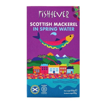 Fish4ever Mackerel In Spring Water 125g contains sustainably fished UK mackerel, packed in Scottish spring water. High in omega-3 and protein, low in salt, and ideal for sushi, dips, or salads. Fully traceable, eco-friendly, and suitable for a healthy diet.