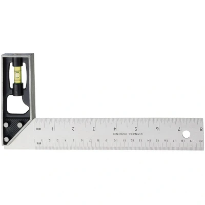 General description This is a standard try and mitre square designed for precise measurements in woodworking and metalworking. It features a lightweight die-cast stock with a built-in spirit level to ensure accurate horizontal and vertical readings. The square has a durable black japanned finish for protection and visibility. The stainless steel blade measures 6 inches (150mm), with ground edges for accuracy, and is graduated in both inches (16ths) and millimeters for versatile use. Technical specifications Blade length: 6 inches (150mm) Material: Stainless steel blade with ground edges Finish: Black japanned Graduations: Inches (16ths) and millimeters Features: Spirit level for horizontal and plumb readings Compatibility and accessories Suitable for woodworking, metalworking, and general construction tasks Compatible with standard measuring tools and squares Installation No installation required; ready to use out of the box Usage Use the spirit level to check for horizontal or