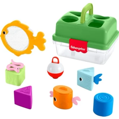 Tackle box-themed shape sorter activity toy for babies with fishing-themed blocks and accessories for early pretend play Includes 6 shape blocks to sort into the matching slots in the tackle box lid “Catch” of the day! Includes fishing net to scoop fish blocks All pieces store inside the tackle box with an open & close lid for fill and spill action This toy helps foster problem-solving, fine motor skills, and pretend play for infants and toddlers ages 6 months and older, Manufacturer: Mattel