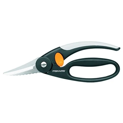 Fish scissors (blade length: 7 cm) for professionals and amateur cooks to open and cut fish and remove fish scales, Suitable for right- and left-handed users as well as for hands of different sizes Easy to hold and firm hold thanks to ergonomically shaped handle made of synthetic material, One-handed locking of scissors Fast and clean working thanks to serrated blade made of stainless steel, Effortless cutting of bones thanks to adjustable blade tension Made in Finland: High durability, easy cleaning - dishwasher safe Contents: 1x Fiskars fish shear, Functional Form, Dimensions: Cutting blade length 7 cm, Total length: 22 cm, Weight: 165 g, Material: Steel/synthetic material, Colour: black/orange, 1003032, Weight: 0.40124131684 pounds, Manufacturer: Fiskars
