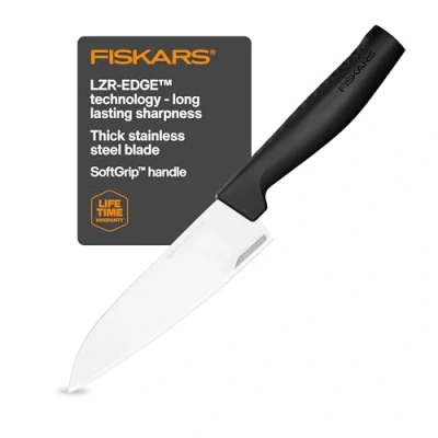 Elegant chef's knife (blade length: 13.5 cm) for professional and amateur chefs for chopping, mincing, cutting and slicing fruit, vegetables, meat and fish, ideal for right and left-handers High cutting power thanks to the sharp blades made of Japanese steel, revolutionary LZR-EDGE technology for long-lasting sharpness and edge retention Pleasant feel and firm grip thanks to ergonomically shaped and textured handle made of high-quality plastic, balanced weight for greater comfort High durability, Easy to clean, Dishwasher-safe, Recommended hand-washing for long-lasting sharpness, Finnish design Contents: 1x Fiskars chef's knife, Hard Edge, dimensions: cutting blade length 13.5 cm, total length: 25.1 cm, weight: 93 g, material: quality steel/plastic, colour: silver/black, 1051749, Weight: 0.14550509292 Pounds, Manufacturer: Fiskars