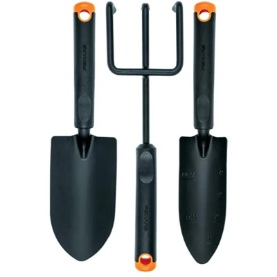 General description The Fiskars Ergo Nursery Set includes three essential gardening tools designed for plant care and nursery work. Each tool features an ergonomic handle for comfortable use and a hanging hole for easy storage. Made from durable, high-quality materials, these tools are suitable for both beginners and experienced gardeners, helping you maintain your plants efficiently and comfortably. Technical specifications Color: Black EAN: 6411501351074 Compatibility and accessories Suitable for use in plant nurseries, gardens, and home gardening projects Compatible with standard gardening accessories and storage solutions Installation No installation required; tools are ready to use out of the box Usage Standard Trowel: ideal for digging, planting, and transferring soil Transplanting Trowel with graduations: perfect for transplanting small plants and flowers with precise depth measurement Weeding Rake: suitable for loosening soil, aerating, and removing weeds Other information