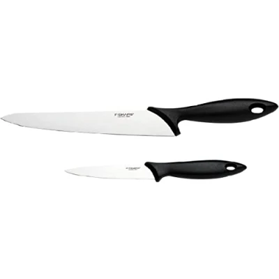 2-piece knife set with kitchen knife and paring knife, for cutting fruit, vegetables, meat and fish or for simply peeling and cutting fruit and vegetables Robust, durable handles made of PP plastic with a large finger stop for safe cutting High cutting power thanks to sharp blades made of stainless Japanese steel with long-lasting sharpness High durability, Easy to clean, Dishwasher-safe, Hand-washing recommended for long-lasting sharpness, Product packaging contains 90 Percent less plastic compared to the previous model Contents: 1x Fiskars knife set, 2-piece, Essential, kitchen knife and paring knife (blade lengths: 21 cm and 11 cm respectively), stainless steel/PP plastic, black, 1065582, Weight: 0.27998707274 pounds, Manufacturer: Fiskars