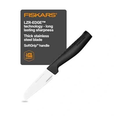 Elegant Peeling Knife with straight blade (blade length: 8.8 cm) for professionals and hobby cooks for peeling and cutting fruit and vegetables such as apples, pears, cucumbers, onions or peppers, optimally suited for right and left handed use High cutting power thanks to the sharp blades made of Japanese steel, revolutionary LZR-EDGE technology for long-lasting sharpness and cutting durability Pleasant feel and firm grip thanks to ergonomically shaped and structured handle made of high-quality plastic, balanced weight for more comfort High durability, easy cleaning, dishwasher safe, recommended hand washing for long lasting sharpness, finnish design Contents: 1x Fiskars Peeling Knife, Hard Edge, Dimensions: Cutting blade length 8.8 cm, Total Length: 20.8 cm, Weight: 72 g, Material: Quality steel/plastic, Colour: Silver/black, 1051777, Weight: 0.11243575362 pounds, Manufacturer: Fiskars