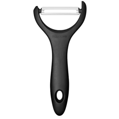 Y-shaped peeler for peeling round or oblong fruit and vegetables such as asparagus, cucumbers, potatoes and apples, Incl. cutter for damaged areas Optimum adaptation to all contours of the food thanks to movable blade, quick and economical peeling in one direction possible High durability and high-quality workmanship thanks to robust, rustproof stainless steel blade Easy to clean, dishwasher-safe, product packaging contains 90 Percent less plastic compared to the previous model Contents: 1x Fiskars vegetable peeler, Essential, dimensions: 14.3 x 6.5 cm, weight: 25 g, material: plastic/steel, colour: black, 1065599