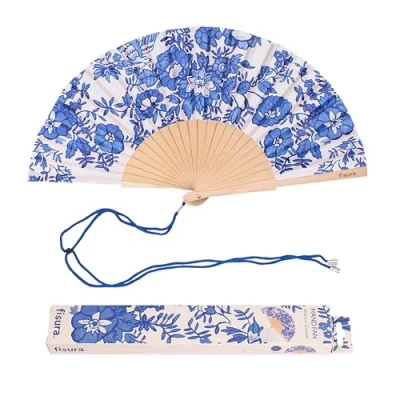 Fisura Original Folding Fan with Flowers Print, Modern and Colourful Handheld Fan, Blue & White Design for Wedding, Rave, Festival Includes Strap. Size: 42.5 x 23 cm