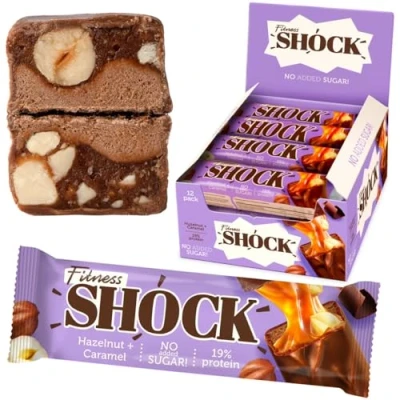 FitnesSHOCK Protein Bar 12pcs no added sugar, 19% protein, low carb (5,5g), rich in fibre, calorie, 12 pack fitness chocolate bars box, palm oil free, flour, 12x50g Hazelnut Caramel Flavor