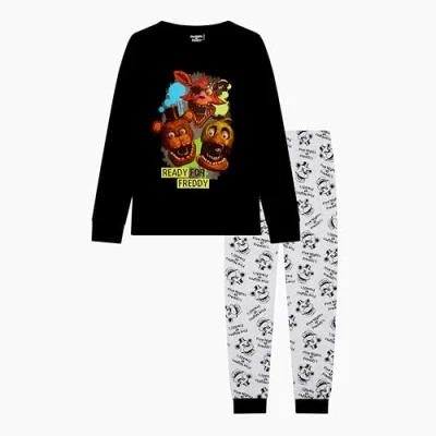 Design: Black top showcasing Withered Foxy, Withered Chica, and Freddy with the "Ready for Freddy" slogan. Trousers: Grey bottoms featuring a repeating pattern of the FNAF logo and characters Sizes Available: Suitable for boys aged 5 to 13 years. Material: Soft and breathable fabric ensuring comfort throughout the night. Care Instructions: Machine washable for easy maintenance.