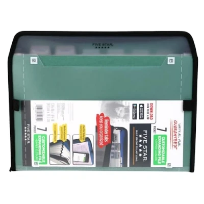 LASTS ALL YEAR. GUARANTEED! Scan, study and organize your notes with the Five Star App. The clear front pocket on the file makes any paper compatible with the Five Star App, so you can access your notes, handouts and more from any device. Get organized! 6 tabs easily pull up to serve as a reminder as to what’s filed and where. They also help you with prioritization and organization. Durable plastic outer shell with secure zipper closure helps protect those important papers, while reinforced gussets help prevent sides from tearing Convenient storage for pens with 2 loops on the outside of the file. Holds letter size 8-1/2" x 11" sheets. Available in Seaglass Green.
