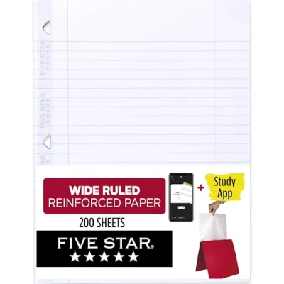 LASTS ALL YEAR. GUARANTEED! Guarantee is valid for one year from purchase date. Does not cover misuse. Scan, study and organize your notes with the Five Star Study App. Create instant flashcards and sync your notes to Google Drive to access them anywhere from any device. Double the strength of the leading competition, based upon independent lab testing of tension strength of Five Star Filler Paper against the leading Reinforced Filler Paper manufacturer Each pack has 200 loose-leaf wide ruled sheets of heavyweight paper that fights ink bleed and provides a high-quality writing surface for your notes and homework. Sheets measure 8" x 10-1/2". Our patented triangle-shaped holes turn easily along binder rings. Strong reinforcement tape helps resist tearing from rings. Made with SFI certified paper.
