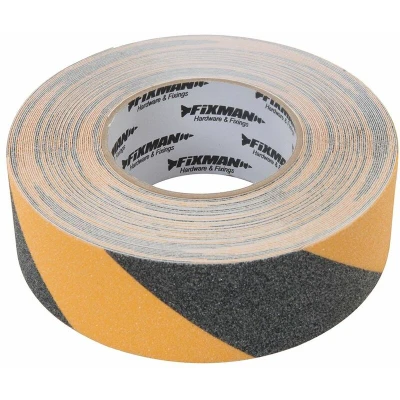 ManoManoGeneral description Fixman Anti-Slip Tape is designed to reduce the risk of accidents on slippery, uneven, or split-level floor surfaces. This high-quality tape features an abrasive surface on a durable PVC carrier, ensuring effective slip resistance. Technical specifications Dimensions: 50mm x 18m Material: PVC carrier with abrasive surface Adhesive: Aggressive solvent-based adhesive Usage Quick and easy to apply Available in a range of colors to blend in with existing flooring or to denote hazards