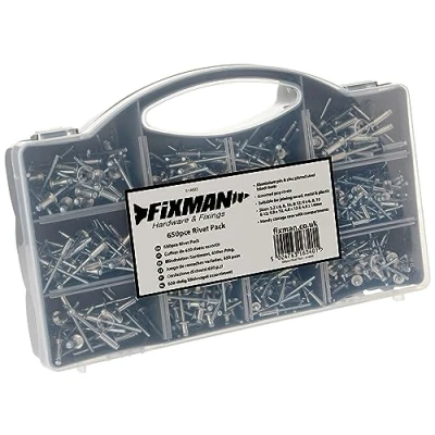 Aluminium pin and zinc-plated steel blind rivets Assorted pop rivets Suitable for joining wood, metal and plastic Sizes: 3.2 x 6, 8, 10, and 12; 4 x 6, 8, 10 and 12; 4.8 x 10, 4.8 x 12 and 4.8 x 14 mm Handy storage case with compartments, Weight: 0.3086471668 Pounds, Manufacturer: Fixman