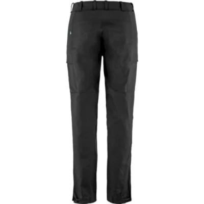 Fjällräven G-1000 trousers with stretch panels and tapered legs. Zippered hand pockets and leg pockets with bellows and low profile flaps. Reinforced leg ends with stainless steel webbing adjuster compatible with various summer and winter boots.