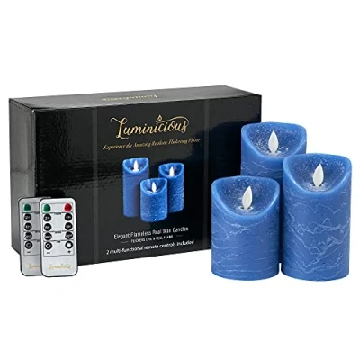 [FALL IN LOVE WITH THE AMAZING REALISTIC FLICKERING FLAME OF YOUR LUMINICIOUS™ FLAMELESS BATTERY CANDLES] - Our customers tell us the flame looks so real but doesn't have any of the drawbacks of regular candles, they are smoke free, odorless, dripless and completely safe. The diameter of all 3 candles is 2.95 inches and the heights of the candles are 3.94, 4.92 & 5.91 inches [IMPRESS YOUR GUESTS WITH THIS BEAUTIFUL PILLAR CANDLE SET] - Crafted from real wax and with a stylish blue textured design they will add a touch of class throughout your home and are completely child and pet friendly. @@@ipLAAq/Xb0X/c1aRMsnXIVrO02tnv/o6@@@ for weddings, parties or any event where you want to add a touch of ambience [SIT BACK, RELAX & TAKE CONTROL] - Set the brightness level and automatically turn off after 2, 4, 6 or 8 hours with the remote control's timer option (one remote control included). Each LED bulb delivers 50,000 hours of lamp life. Use of 2 high-grade AA batteries will provide 300 hours of continuous use (batteries not included) [SURPRISE YOUR FAMILY & FRIENDS WITH THIS PERFECT GIFT] - Our premium quality battery candles are stylishly crafted from real wax and are packaged in an attractive box. They won't believe how real the flickering flame looks [LUMINICIOUS IS THE BRAND YOU CAN TRUST] - Our candle sets are thoroughly inspected by a 3rd party inspection company giving you peace of mind that they have been produced to the highest standards of workmanship. Our candle sets come with a 12 month warranty.