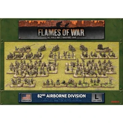 The 82nd Airborne Army Deal is a complete army in a box. Contains: 1x HQ, 2 x Parachute Rifle Platoons, 1 x Mortar Platoon, 1 x Artillery Battery, 1 x Anti-Tank Platoon, 1 x Jeep Recon Patrol, Dice, tokens, and exclusive objectives. Models require assembly and painting. Model scale is 15mm For ages 15+, Manufacturer: Flames of War