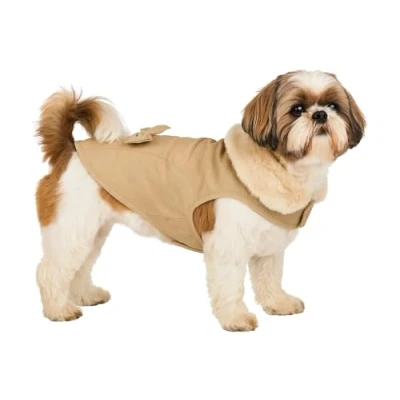 This Guzzi Beige Coat ensures your dog stays warm and dry during chilly days. The soft fleece inner layer keeps body heat in, while the water-repellent polyester protects against wind and light rain. A perfect mix of style and practicality. Made from durable water-repellent polyester, this coat keeps your dog comfortable and dry in any weather. Its soft texture ensures breathability, while the material remains lightweight. Washable at 30°C for daily use convenience. Lined with premium fleece, this coat ensures a pleasant warmth on cold days. The soft texture feels gentle against the fur, while its breathable design prevents overheating. Ideal for comfort and style during walks. The Guzzi Beige Coat’s Velcro closures ensure a customized fit and easy handling. The coat stays securely in place while your dog moves freely, and the leash opening provides effortless access to the collar or harness. Stylish yet functional, the Guzzi Beige Coat is adorned with a delicate bow that gives it a chic and charming appearance. Ideal for owners looking to combine warmth and beauty in one coat.