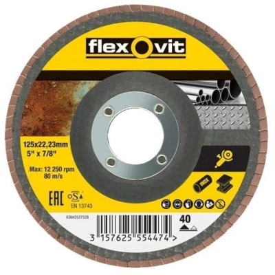 General description Flap discs from Flexovit are designed for use with angle grinders to sand contoured metal surfaces, blend welds, deburr, and finish castings. Their angled flaps allow more abrasive contact with the workpiece compared to conventional fiber discs, increasing efficiency and productivity. Technical specifications Coarse grade - 40 Grit Diameter: 125mm Suitable for metal, wood, and paint Supplied individually Compatibility and accessories Compatible with standard angle grinders Use with appropriate backing pads if necessary Installation Attach the flap disc securely to the angle grinder's spindle Ensure the disc is properly centered and tightened before use Usage Use with moderate pressure to achieve even sanding and finishing Operate at recommended speeds for safety and optimal results Wear appropriate personal protective equipment, including gloves and eye protection