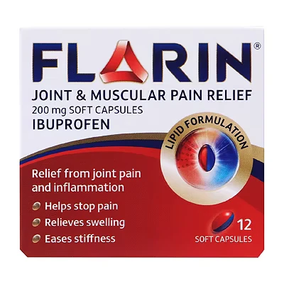 Flarin Joint & Muscular Pain Relief 200 mg soft capsules, a unique lipid formulated ibuprofen which is absorbed in the small intestine FOR JOINT PAIN, NO OTHER IBUPROFEN IS PROVEN TO BE MORE EFFECTIVE Relieves joint pain, muscle pain, back pain, inflammation, swelling and stiffness Suitable for relief of fever, headaches, migraine, cold and flu symptoms, rheumatic, dental and period pain Contains Gelatin from bovine. Gluten free and dairy free This product is quantity restricted and a maximum of 2 products containing paracetamol, aspirin or ibuprofen can be bought per week per customer, Always read the label
