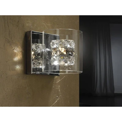 Wall lamp of 1 light made of metal, chrome finish. Double glass shade, exterior of molded glass and interior of clear and smoke faceted crystals.