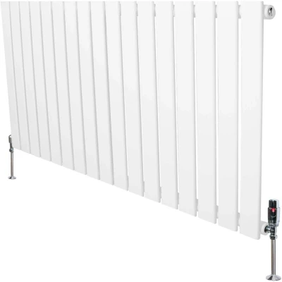 Infuse warmth into your home with our cutting-edge flat single column radiators in white and thermostatic chrome valve set - a perfect blend of timeless elegance and modern efficiency. Crafted with precision from premium 1.5mm carbon steel, these radiators are not only built to last but also designed to impress. Standing tall at 600mm and spanning 1190mm in width, they offer versatility in placement, fitting seamlessly into various spaces with ease. Boasting a sleek white finish, these radiators serve as a striking focal point, enhancing the ambiance of any room with their bold presence. Their appeal goes beyond aesthetics as they are meticulously engineered for optimal performance. Featuring a single column with robust steel tubes measuring 60mm x 15mm, they deliver superior heat output, ensuring your space remains cosy and comfortable. The triple layered powder coating not only enhances durability but also provides resistance against wear, preserving the radiator's pristine