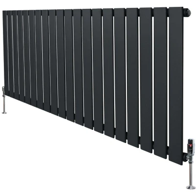 Infuse warmth into your home with our cutting-edge flat single column radiators in anthracite grey and thermostatic chrome valve set - a perfect blend of timeless elegance and modern efficiency. Crafted with precision from premium 1.5mm carbon steel, these radiators are not only built to last but also designed to impress. Standing tall at 600mm and spanning 1400mm in width, they offer versatility in placement, fitting seamlessly into various spaces with ease. Boasting a sleek anthracite grey finish, these radiators serve as a striking focal point, enhancing the ambiance of any room with their bold presence. Their appeal goes beyond aesthetics as they are meticulously engineered for optimal performance. Featuring a single column with robust steel tubes measuring 60mm x 15mm, they deliver superior heat output, ensuring your space remains cosy and comfortable. The triple layered powder coating not only enhances durability but also provides resistance against wear, preserving the
