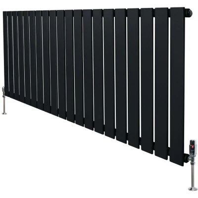 Infuse warmth into your home with our cutting-edge flat single column radiators in black and thermostatic chrome valve set - a perfect blend of timeless elegance and modern efficiency. Crafted with precision from premium 1.5mm carbon steel, these radiators are not only built to last but also designed to impress. Standing tall at 600mm and spanning 1400mm in width, they offer versatility in placement, fitting seamlessly into various spaces with ease. Boasting a sleek black finish, these radiators serve as a striking focal point, enhancing the ambiance of any room with their bold presence. Their appeal goes beyond aesthetics as they are meticulously engineered for optimal performance. Featuring a single column with robust steel tubes measuring 60mm x 15mm, they deliver superior heat output, ensuring your space remains cosy and comfortable. The triple layered powder coating not only enhances durability but also provides resistance against wear, preserving the radiator's pristine