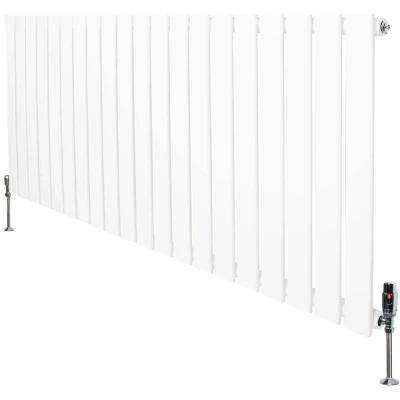 Infuse warmth into your home with our cutting-edge flat single column radiators in white and thermostatic chrome valve set - a perfect blend of timeless elegance and modern efficiency. Crafted with precision from premium 1.5mm carbon steel, these radiators are not only built to last but also designed to impress. Standing tall at 600mm and spanning 1400mm in width, they offer versatility in placement, fitting seamlessly into various spaces with ease. Boasting a sleek white finish, these radiators serve as a striking focal point, enhancing the ambiance of any room with their bold presence. Their appeal goes beyond aesthetics as they are meticulously engineered for optimal performance. Featuring a single column with robust steel tubes measuring 60mm x 15mm, they deliver superior heat output, ensuring your space remains cosy and comfortable. The triple layered powder coating not only enhances durability but also provides resistance against wear, preserving the radiator's pristine