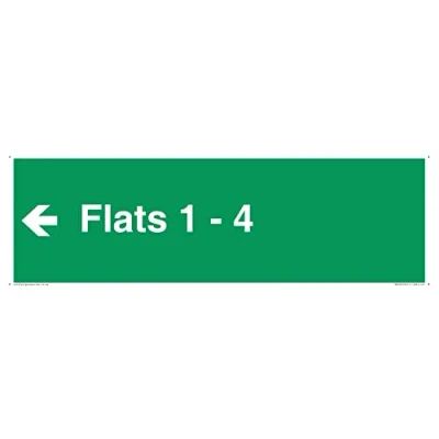 E913 : Left arrow (90 deg supplimentary) This sign is made from plastic semi-rigid 1mm 1mm thin plastic sign, can be screwed, stuck with adhesive, or attached with cable ties. Not suitable for hanging. 4mm Corner holes Landscape Letterbox Sign Text: Flats 1 - 4