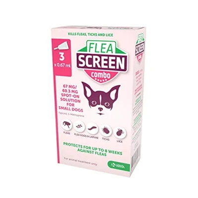 FLEA & TICK TREATMENT - A UK veterinary licensed flea treatment for small dogs and puppies over 8 weeks old (2-10kg). Effectively kills fleas, flea eggs, ticks and lice to keep your dog protected from external parasites. DUAL-ACTION FORMULA - Contains fipronil and S-methoprene, proven activs that kill adult fleas and ticks while preventing flea eggs and larvae from developing, breaking the flea life cycle and stopping reinfestations. LONG-LASTING PROTECTION - Each pipette provides up to 8 weeks of continuous flea and tick defence when applied monthly as directed, helping keep your dog comfortable, protected and parasite-free with regular use. EASY SPOT-ON APPLICATION - Apply directly to dry skin at the back of the neck with a quick-drying formula. Avoid bathing for 2 days after application. Safe for pregnant and nursing dogs (keep puppies away until dry). COMPLETE PARASITE CONTROL - Use regularly to treat and prevent flea and tick infestations. Combine with Worm Screen Combo Dog tablets to help prevent tapeworm infections spread by fleas for complete parasite protection.