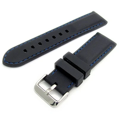Black with blue contrast stitching Soft flexible silicone rubber 18mm Width where the strap fixes to your watch 177mm (7 inches) when buckled on the last hole. Add the length of your watch case to this to give the max wrist size it will fit Spring bars/watch pins included at no extra cost
