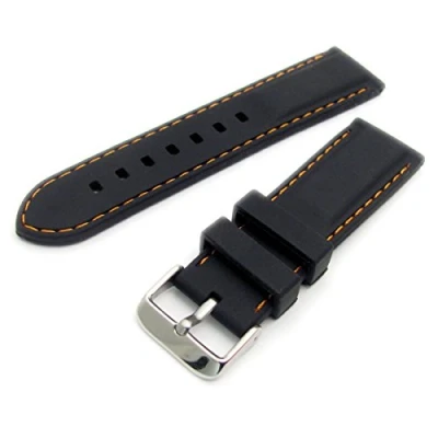 Flexible Black Silicone Watch Strap with Coloured Contrast Stitching 18mm Chrome (Silver Colour) Buckle (Orange Stitching)