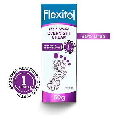 Flexitol Rapid Revive Overnight Foot Cream 30 Percent Urea for Extremely Dry, Hard, Rough Skin on Feet Results in 1 Night Clinically Proven Care High Suitable Diabetics. 50g
