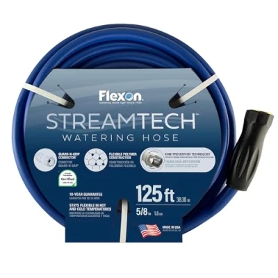 Flexible Polymer Construction to remain flexible in hot and cold temperatures Male Swivel Coupling with Kink Prevention Technology Guard-N-Grip connector for leak proof connection to spigot 125ft length allows it to reach most areas of your lawn Made in the USA, Weight: 12.0 pounds, Manufacturer: Flexon
