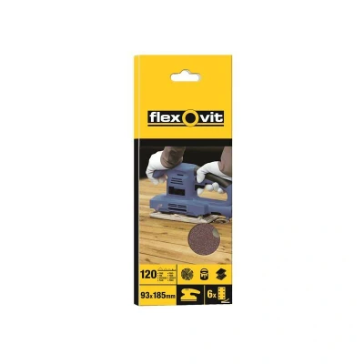 General description This pack of Flexovit 1/3 Sanding Sheets includes 10 perforated sheets designed for general purpose sanding and stock removal on wood, paint, and metal surfaces. Made with high-performance aluminium oxide, these sheets offer sharpness and durability, ensuring long-lasting use. The heavy paper backing adds strength and longevity, making them ideal for various sanding tasks. Technical specifications Size: 93 x 230mm Grit: Fine 120 Pack Size: 10 sheets Grit Type: Fine Backing: Heavy paper Perforation: 1/3 pattern with 8 parallel holes Compatibility and accessories Suitable for use on wood, paint, and metal surfaces Compatible with standard sanding tools and blocks Installation Attach the sanding sheets to your sanding block or power sander according to the tool's instructions Ensure the perforated side is facing outward for optimal dust extraction and performance Usage Use for smoothing surfaces, removing paint or varnish, and preparing surfaces for finishing Apply